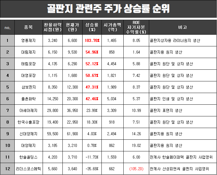 골판지 관련주의 지난 1년간 주가 상승률 순위와 시가총액, ROE(자기자본수익률) 리스트 입니다. 골판지 상자용 라이너원지를 생산하는 영풍제지가 1년간 103%나 급등하며 상승률 1위를 기록한 가운데, 골판지 원지와 원단을 생산하는 대림제지, 태림포장, 대영포장 등이 50% 이상의 상승률을 보여주며 그 뒤를 차지하고 있습니다.