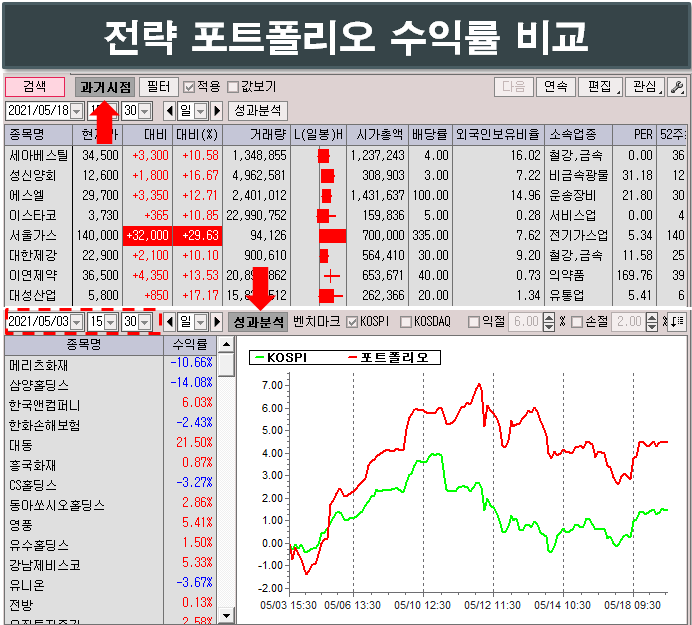 지금까지 간단하게 상승률 상위주를 검색하는 방법에 대해서 알아보았는데요. 검색식이 곧 내가 만든 전략입니다. 이렇게 전략식을 통해 검색된 종목으로 포트폴리오를 구성했을때 코스피 대비 상대 수익률을 알 수 있는데요.