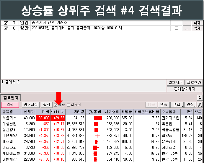 4 . 상승률 상위주 검색 결과