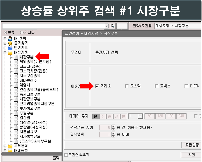 먼저 주식시장을 설정하겠습니다. hts상단에 있는 종목검색(전략작성)을 클릭하면 위와 같이 나만의 전략을 만들수 있는 창이 뜨는데요. 좌측에 있는 대상지정 하단 시장구분을 선택하셔서 원하는 시장을 설정하시면 됩니다.